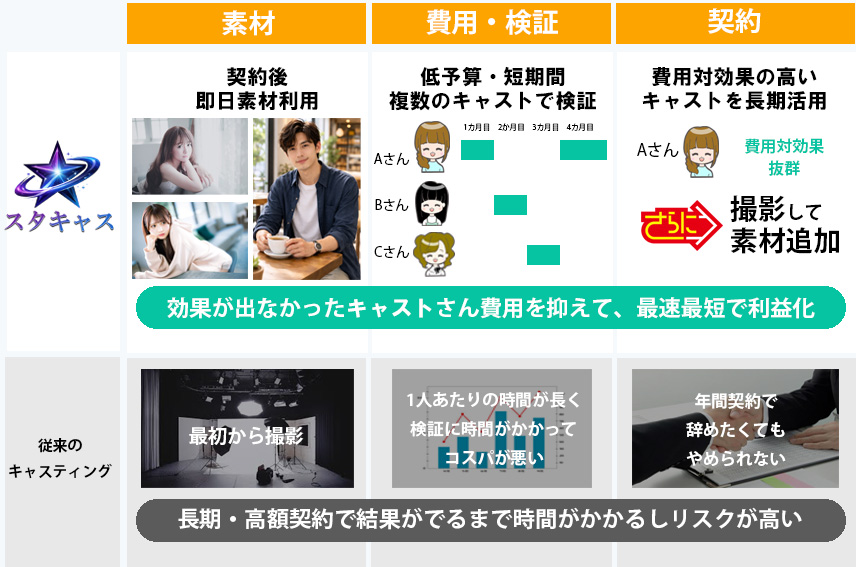 ネットで色々調べて、どこも契約金が高くてなかなか手が出せないのと、ルールが多くて契約ができませんでした。スタキャスはいままでにないサービスで、キャスティングだけでなく、有益な写真や映像、そしてアイディアやAIテクノロジーを使っていて、お値段以上です!10万円どころか1000万円以上の利用価値を感じます。